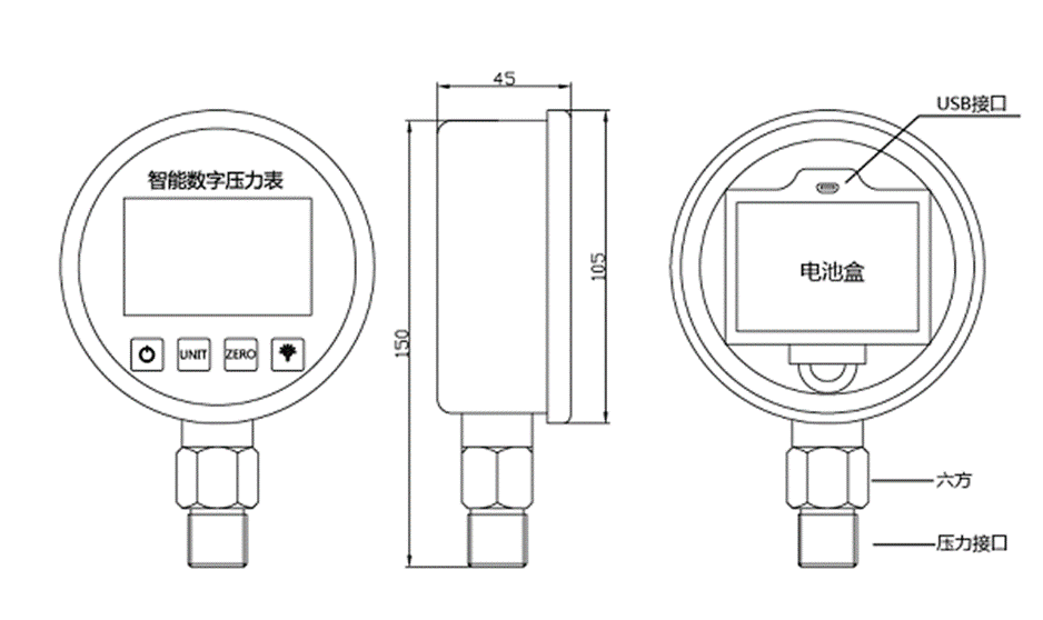 SUAY80壓力開關是一款高精度智能型數字壓力表,內置高精度壓力傳感器,能夠準確的實時顯示壓力,并且具有精度高、長期穩定性好的特點。配備5位顯示的大尺寸LCD液晶顯示,具有清零、背光、開關機、單位切換、低電壓報警、峰值記錄等多種功能,操作簡單,安裝方便。殼體和接頭采用304不銹鋼,抗震性好,能夠測量氣體、液體、油等對不銹鋼無腐蝕的介質。用3節5號電池供電,也可以采用USB供電,續航功耗低、時間長,適用于便攜式壓力測量、設備配套、校驗設備等壓力測量領域。